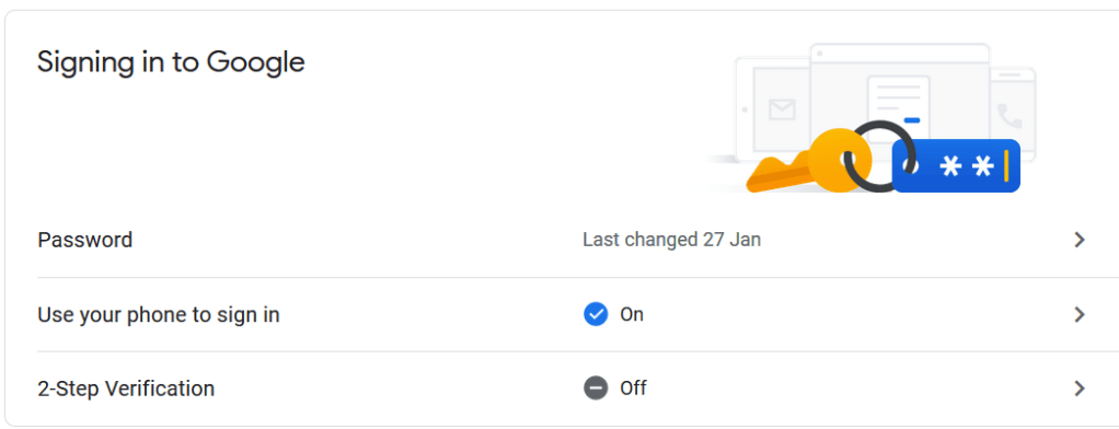 Google menawawrkan fitur bernama 2-step verification dan menggunakan handphone untuk log in . 2-step verification mencegah orang lain untuk mengakses akun kita meskipun mereka mengetahui password kita. Ini karena, Google akan meminta kita memverifikasi bahwa kita akan log in dengan device lain yang telah kita tetapkan. Nah, device ini dapat berupa handphone atau bahkan USB yang ada di sekitar kita.